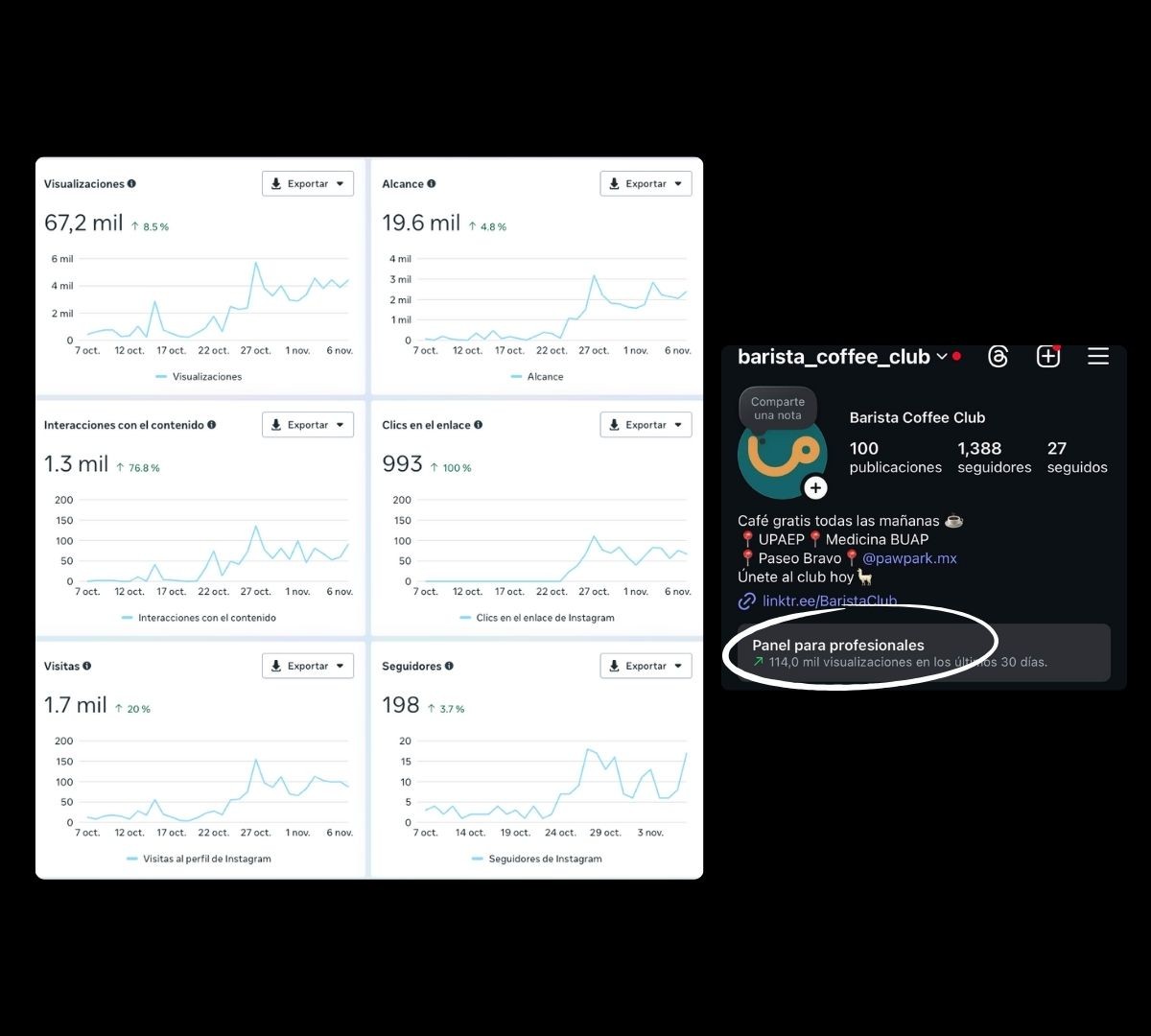 Resultados de visualizaciones en perfil de instagram y página de facebook en un mes, con presupuesto de ads bajo: